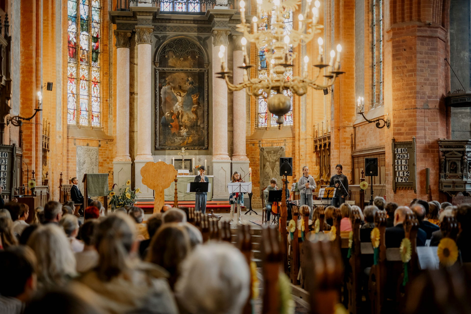 Um 13 Uhr versammelten sich etwa 200 Gäste in der Malchiner St.-Johannis-Kirche, wo schon vor 20 Jahren die Gründungsmitglieder des Fördervereins der Benjamin-Schule die Gründung der evangelischen Schule mit einem Festgottesdienst feierten. Der Festgottesdienst anlässlich des 20-jährigen Bestehens wurde von Fördervereinsmitgliedern, Mitarbeiterinnen und Mitarbeitern der Schule, sowie Schülerinnen und Schülern und Elternteilen gestaltet. Der Vorstandsvorsitzende des Fördervereins, Georg von der Goltz, hielt die Begrüßungsrede. Im Gottesdienst musizierten unter anderem die Kinderband der Evangelisch-Lutherischen Kirchengemeinde Malchin, sowie der Kinderchor der Benjamin-Schule unter Leitung von Julia Labatzki. Kantor Michael Haerter spielte die Orgel, Pastor Markus Hasenpusch hielt die Festpredigt.