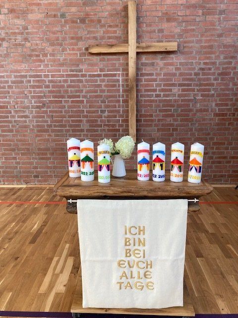 Zur ersten Andacht im neuen Schuljahr konnten wir unsere neu erworbenen Antependien (Altarbehang) einsetzen. Mit Hilfe des Gustav-Adolf-Werk der Nordkirche haben wir uns verschiedene Antependien kaufen können, die im Kirchenjahr Pult und Altar schmücken werden.