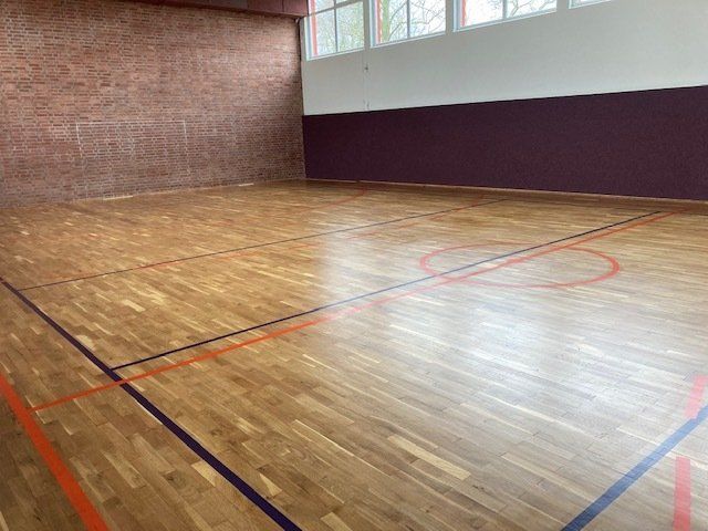 Der gesamte Boden wurde abgeschliffen, schadhafte Stellen ausgebessert, mehrfach lackiert und mit neuen Spielfeldlinien versehen.