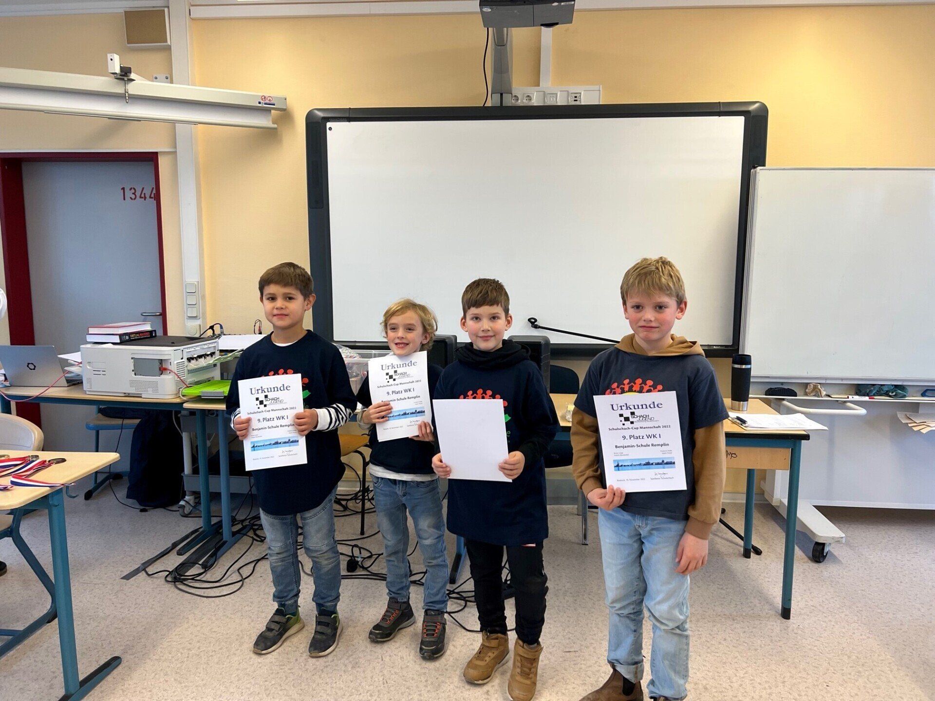 Obwohl Friedo erst die 3. Klasse besucht, hat er sich hervorragend in der WKII geschlagen. Jeder Spieler musste mindestens 4 Partien bestreiten und hatte für jede Partie 15 Minuten Spielzeit. Alle Spieler haben ihr Bestes gegeben. Für die Mannschaft der Wettkampfklasse 2 reichte es am Ende des Turniers für den Gesamtsieg. Die Mannschaft der Wettkampfklasse 1 belegte einen guten 9. Platz.